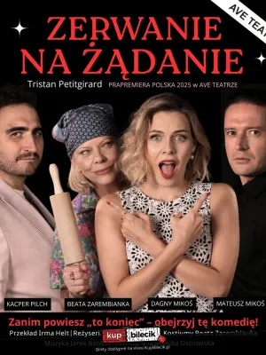 Przygotuj się na wieczór pełen emocji z komedią "Zerwanie na żądanie"! Już 11 listopada w Rzeszowie odbędzie się niezwykły spektakl, który z pewnością na długo pozostanie w Twojej pamięci. Eric, profesjonalny "zerwacz", ma zrealizować zlecenie od Anny, ale sytuacja szybko wymyka się spod kontroli. Zaskakujące zwroty akcji, błyskotliwe dialogi oraz humor sytuacyjny sprawią, że każdy widz będzie śmiać się do łez. W rolach głównych wystąpią utalentowani aktorzy: Dagny Mikoś, Beata Zarembianka, Mateusz Mikoś i Kacper Pilch. Ta inteligentna francuska komedia pomyłek ukazuje zawirowania współczesnych relacji, w których uczucia często przychodzą w najmniej oczekiwanym momencie. "Zerwanie na żądanie" to spektakl, który bawi, zaskakuje i skłania do refleksji. Nie przegap tej okazji, by spędzić wyjątkowy wieczór z przyjaciółmi lub bliskimi. Spędź ten wieczór wyjątkowo i dołącz do nas!